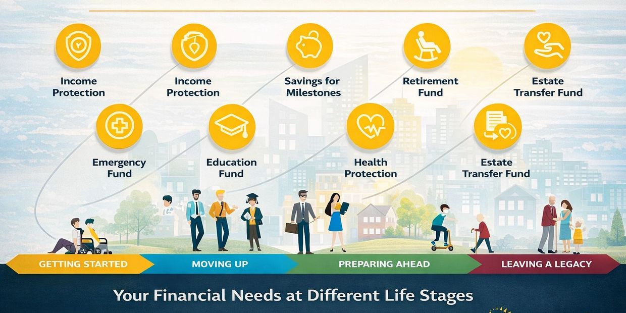 Our approach is simple: your financial needs evolve over time, and your strategy should evolve with you. From getting started in your career to growing wealth, protecting your health, preparing for retirement, and leaving a lasting legacy, we provide structured, personalized financial solutions designed for real life.